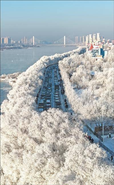 连日来,吉林省吉林市迎来多场雾凇景观。松花江上雾气袅袅,两岸柳树结银花,松树绽银菊,就像美不胜收的水墨画卷。图为1月17日,吉林市阿什哈达雾凇观赏带。